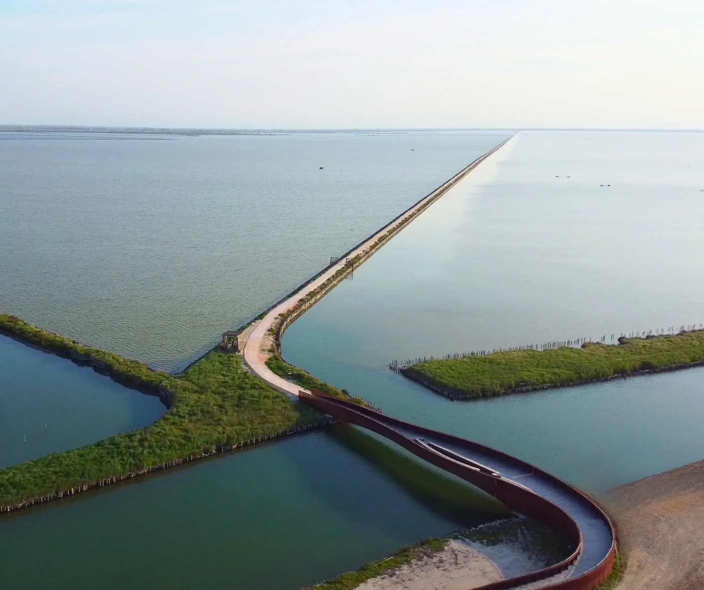 Lungo circa 12 chilometri, il tracciato segue un argine rialzato che attraversa le valli, regalando una vista mozzafiato sui canali, sulle lagune e sugli specchi d’acqua salmastra popolati da fenicotteri, aironi e numerose altre specie di uccelli acquatici.