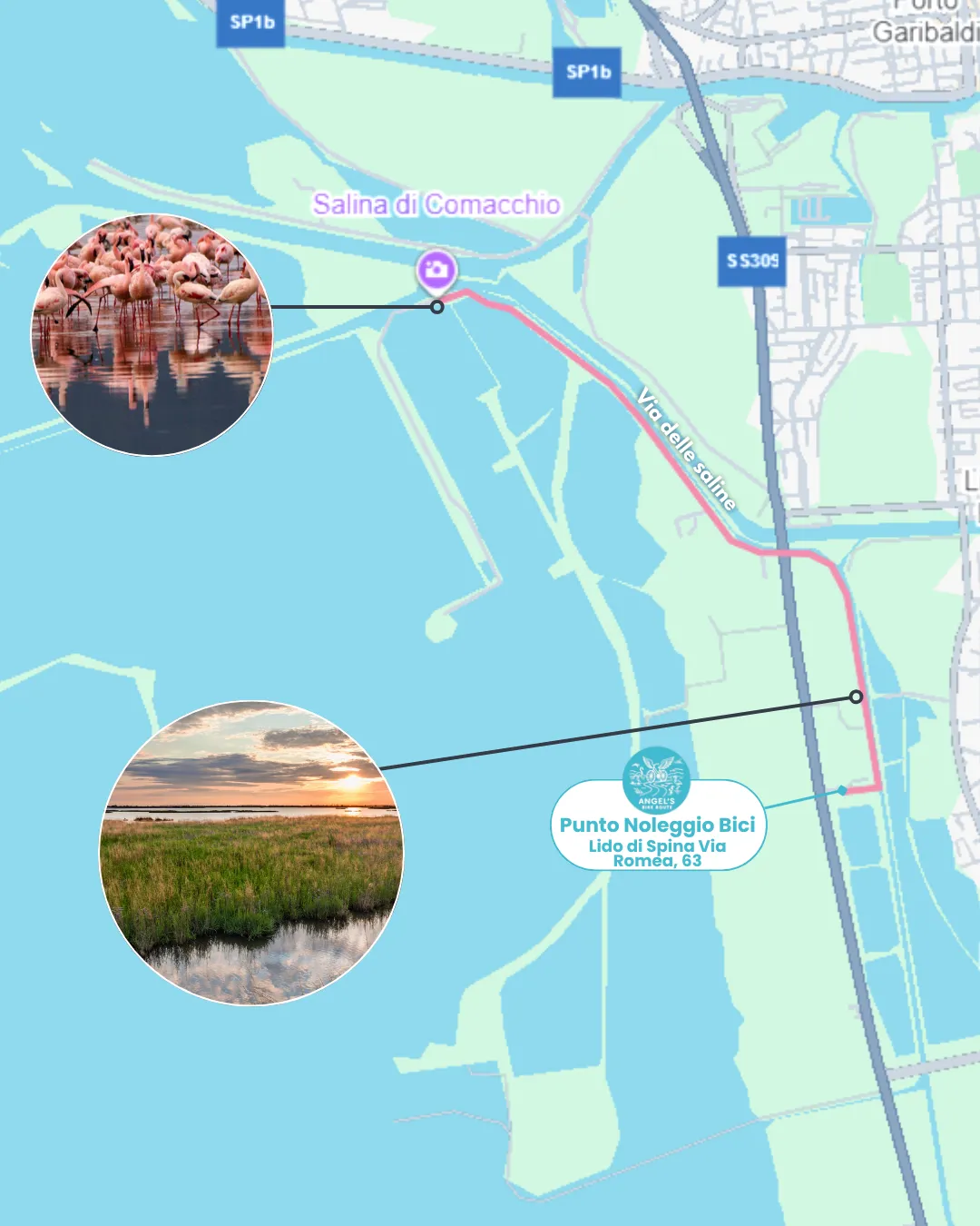 Dal nostro punto noleggio bici, potrai facilmente raggiungere le affascinanti Saline di Comacchio, pedalando lungo un percorso immerso nella natura. Il tragitto parte direttamente dal noleggio, lontano da strade trafficate o pericolose, offrendoti fin da subito un'esperienza rilassante e sicura, in pieno contatto con l’ambiente naturale.