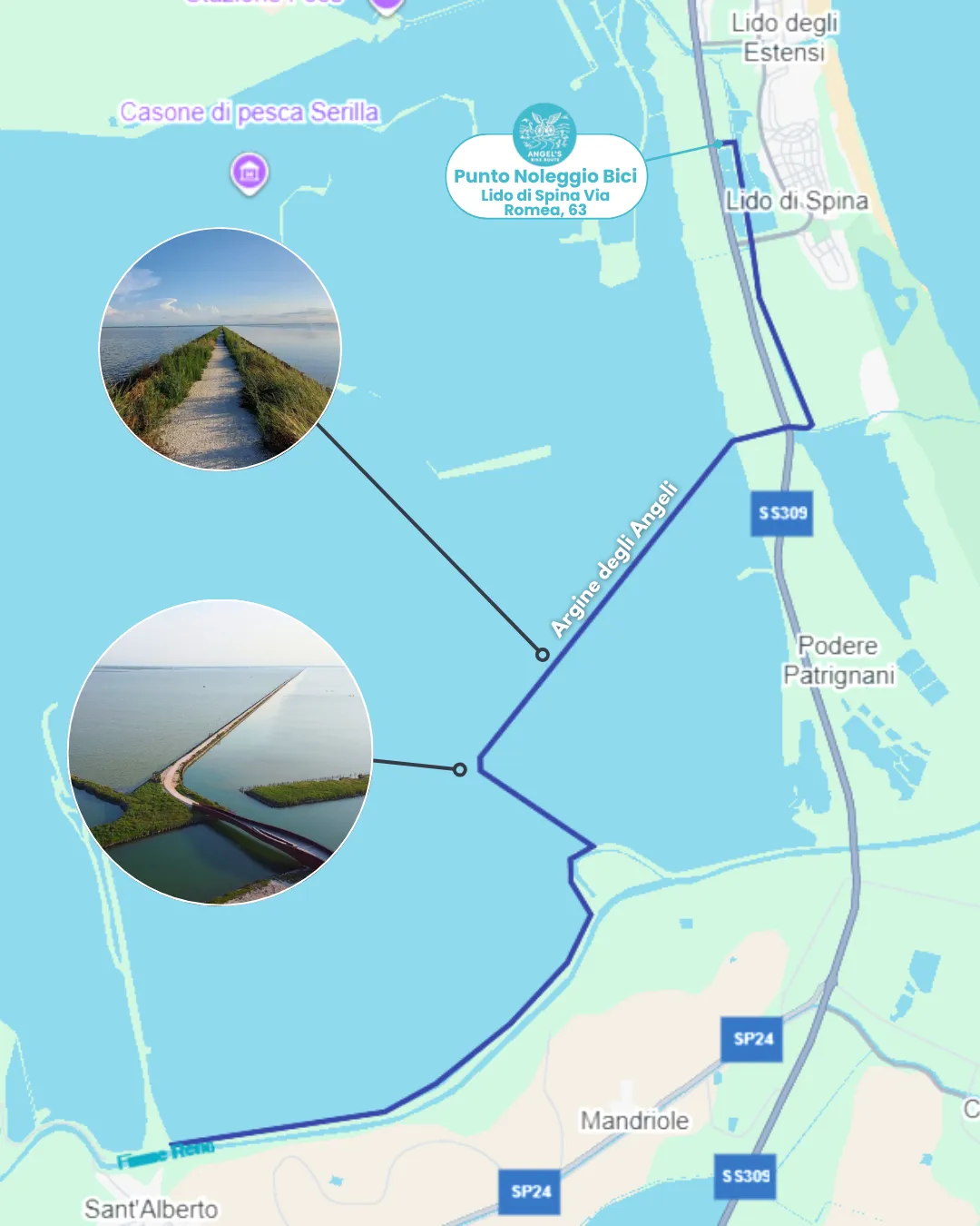 Dal nostro punto noleggio bici puoi partire per uno degli itinerari più affascinanti del Parco del Delta del Po: l’Argine degli Angeli. Un percorso sicuro e immerso nella natura, completamente separato dal traffico, che si snoda tra canali, lagune e panorami mozzafiato.